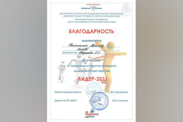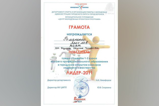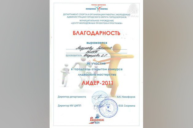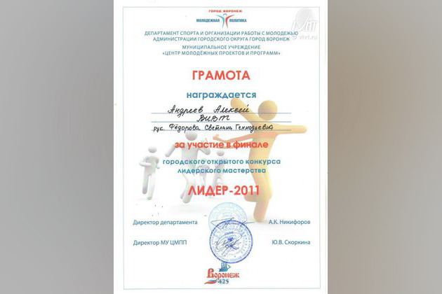 Городской открытый конкурс лидерского мастерства «Лидер-2011», направленный на стимулирование деятельности лидеров детских и молодежных общественных объединений, состоялся 28 ноября 2011 года на базе Дома молодежи. Организаторами конкурса являются: департамент спорта и организации работы с молодежью администрации городского округа город Воронеж; департамент образования администрации городского округа город Воронеж; муниципальное учреждение «Центр молодежных проектов и программ»; Воронежская региональная общественная детская организация «Искра». Участниками конкурса стали учащиеся средних общеобразовательных учреждений и учреждений среднего и высшего профессионального образования – активисты детского и молодежного движения. В их числе были и студенты Воронежского института высоких технологий: Романенко Ярослав и Андреев Алексей.