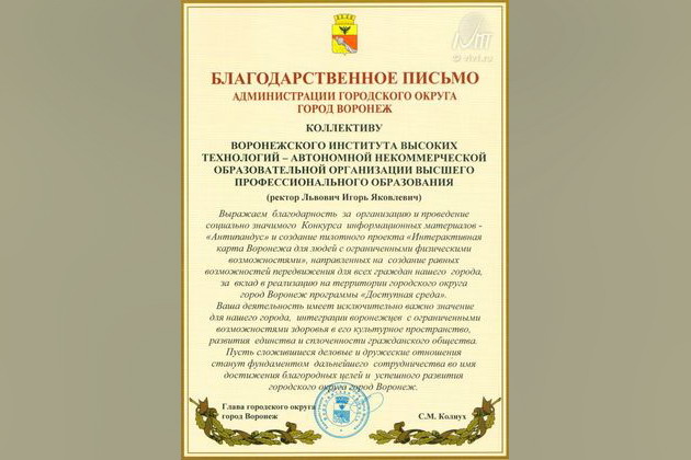 Непосредственно перед церемонией награждения выступил с речью Олег Николаевич Чопоров «Дорогие друзья от имени Воронежского института высоких технологий я рад приветствовать вас на сегодняшней церемонии подведения итогов и благодарю, что вы нашли возможность принять участие в нашем мероприятии. Наш вуз уже на протяжении многих лет уделяет особое внимание обучению и профессиональной ориентации людей с ограниченными возможностями. В 2007 году стартовал проект «Равные возможности», целью которого являлась интеграция в общеобразовательную программу концепции дистанционного обучения с учетом индивидуальных потребностей людей с инвалидностью. По заказу главного департамента образования воронежской области мы создавали концепцию дистанционного обучения людей с ограниченными возможностями, разрабатывали учебный комплекс, тренажеры для довузовской подготовки по информационным технологиям. В прошлом году у нас был открыт специализированный компьютерный класс и курсы для получения дополнительного профессионального образования. На данный момент где-то более 60-ти студентов с ограниченными возможностями обучаются в нашем вузе, поэтому проблемы, с которыми приходится сталкиваться знакомы нам не понаслышке, инициируя сегодняшний конкурс мы надеялись привлечь внимание общественности к данному вопросу и я надеюсь, что благодаря конкурсу и вашим работам нас услышат и улицы нашего города станут доступнее. Спасибо за внимание.